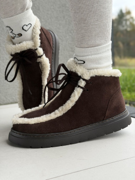 Wyglądają jak marzenie – głęboki, czekoladowy brąz, delikatny połysk weluru i subtelne wykończenie kremowym kożuchem sprawiają, że od razu przyciągają spojrzenia.