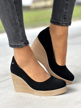 Ich czarny kolor nadaje im ponadczasowej klasyki, jednocześnie pozwalając na swobodne łączenie z różnorodnymi stylizacjami. Wsuwany design sprawia, że są one wygodne w użyciu, a koturna podeszwa dodaje im elegancji i subtelnie wydłuża sylwetkę.