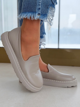 Mokasyny marki OLEKSY wykonane są ze skóry naturalnej zarówno na zewnątrz, jak i wewnątrz buta. Gładka cholewka o jednolitej, szarej kolorystyce prezentuje się estetycznie i minimalistycznie. Wsuwana konstrukcja bez zapięć podkreśla prostotę formy, a staranne przeszycia wokół podeszwy nadają całości schludny, dopracowany wygląd.