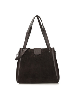 Górna część wykonana jest z miękkiej skóry zamszowej, natomiast dolna z gładkiej skóry licowej, tworząc stylowy kontrast. Wnętrze torebki nie posiada klasycznej podszewki — zamiast tego znajduje się odpinany na klipsach wkład, który pełni funkcję praktycznego organizera. Całość zamykana jest na metalowy zamek w kolorze srebra, podkreślający elegancki charakter modelu.