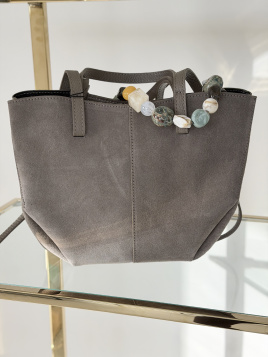 Wykonana z naturalnej skóry, łączy zamszową miękkość z gładką fakturą skóry licowej w dolnej części, tworząc stylowy kontrast. Torebka ma jedną główną komorę zamykaną na metalowy zamek w kolorze srebra, a w środku znajduje się odpinany na klipsach wkład, który pełni funkcję praktycznego organizera.