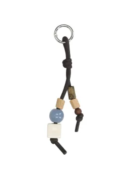 Stylowy brelok do torebki, wykonany z lekkiego tworzywa sztucznego, ozdobiony koralikami w odcieniach bieli, beżu, błękitu i brązu. Świetnie sprawdzi się jako elegancka ozdoba do torebki lub kluczy.