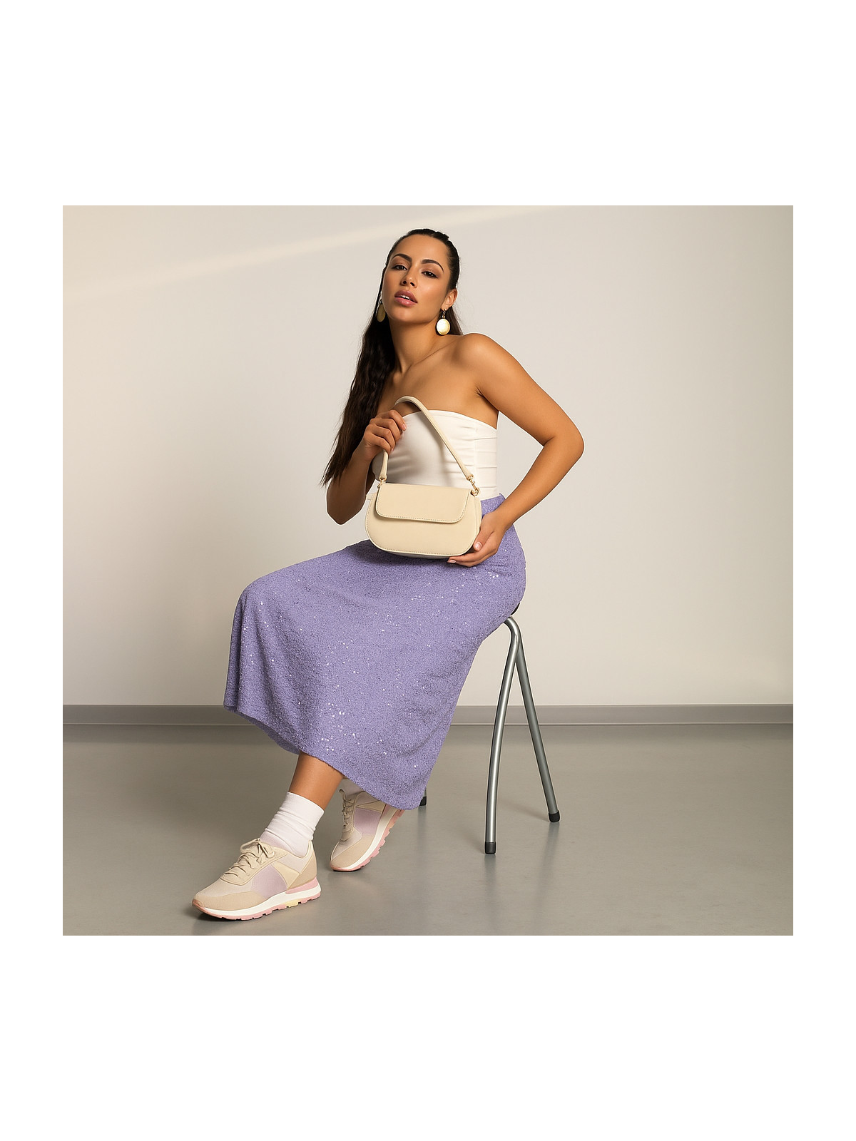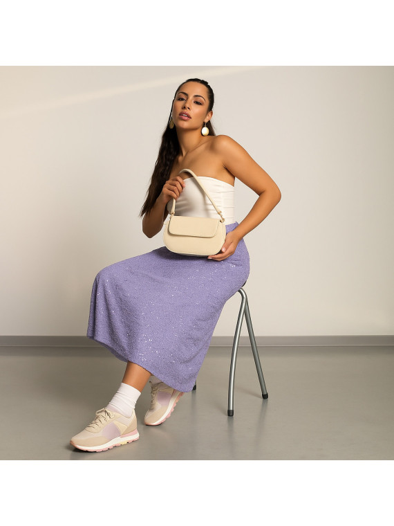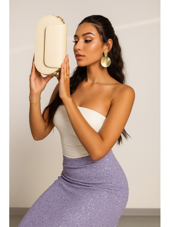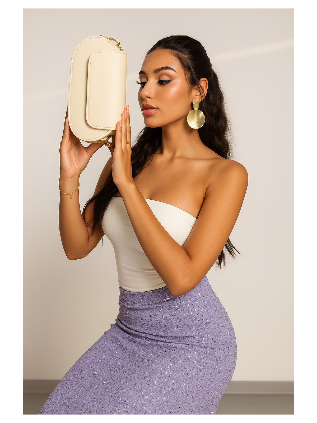 Kompaktowa forma (25 × 13 × 7 cm) sprawia, że doskonale sprawdzi się na wyjścia, uroczystości czy wieczorne kolacje. Złote detale, w tym metalowy zamek, dodają całości klasy i subtelnego blasku. Długi skórzany pasek (110 cm) pozwala nosić ją wygodnie na ramieniu lub jako listonoszkę.