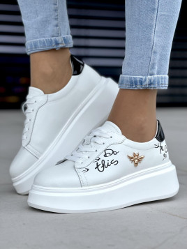 Unikalne białe trampki damskie na platformie złożone z naturalnej skóry stanowią wyjątkowy element letniej garderoby, którym wyróżni się każda kobieta. Ich designerski wygląd, wzbogacony złotą ozdobą oraz czarnymi napisami, nadaje im niepowtarzalny charakter, który przyciąga uwagę i dodaje stylizacji wyjątkowego pazura.
