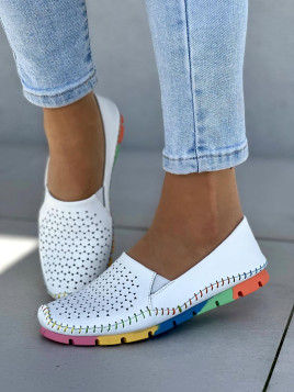 Wygodne ażurowe białe mokasyny damskie na kolorowej podeszwie, skóra naturalna