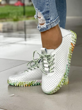 Wygodne ażurowe białe trampki damskie na kolorowej podeszwie, skóra naturalna