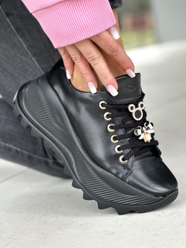 Wykonane z wysokiej jakości skóry naturalnej, te sneakersy charakteryzują się eleganckim czarnym kolorem, który doskonale komponuje się ze złotymi ozdobami. Ich sznurowany design zapewnia idealne dopasowanie do stopy, podczas gdy gruba podeszwa dodaje im nie tylko charakteru, ale także stabilności i wygody. Złote ozdoby nadają im wyjątkowego blasku, sprawiając, że są one doskonałym wyborem dla kobiet pragnących wyróżnić się w tłumie.