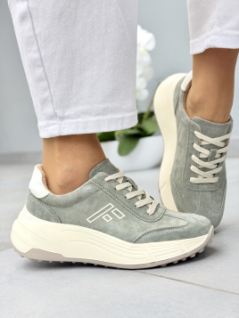 Sneakersy zostały wykonane ze skóry naturalnej. Cholewka ma zamszowe wykończenie w delikatnym, zielonym odcieniu. Model jest sznurowany, z jasnymi sznurówkami oraz kontrastowym, białym detalem z tyłu. Grubsza, jasna podeszwa o wyraźnym bieżniku nadaje całości nowoczesny charakter i stabilną formę. Obuwie wyprodukowano z dbałością o staranne wykończenie i proporcje.