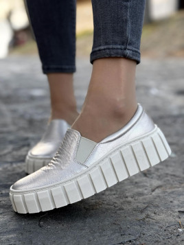 Metaliczny połysk skóry zewnętrznej podkreśla nowoczesny styl i dodaje blasku każdej stylizacji. Wyjątkowa podeszwa o modnym, masywnym wyglądzie łączy miejską elegancję z praktycznym komfortem.